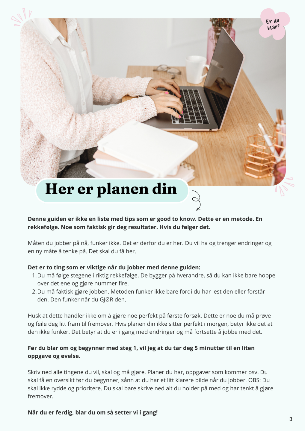 Det du får i denne guiden er ikke noe jeg har lest meg til eller funnet på et kurs. Det er måten jeg faktisk jobber på selv, for å holde oversikten når det er mye på gang.